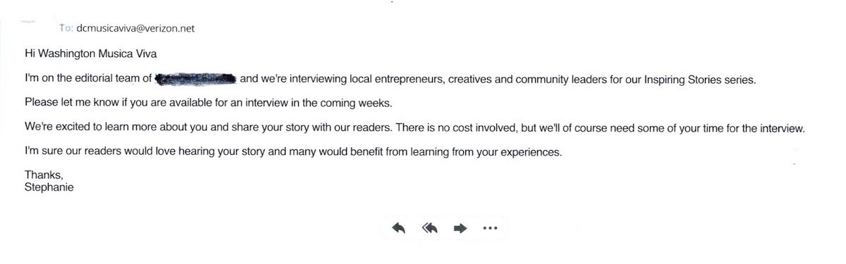 I got an email today from someone (with only a first name) who claims to be an editor at an online mag, which I googled. Despite a lot of protestations from AI and others that it’s legit, it appears to be a national scam, targeting artists.