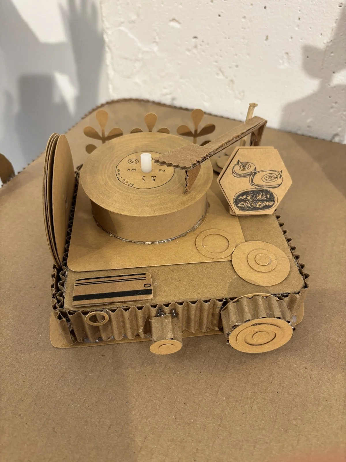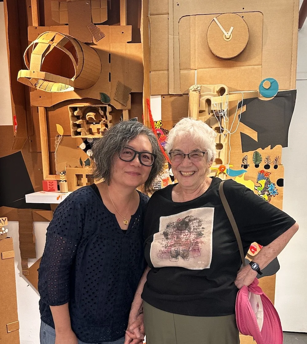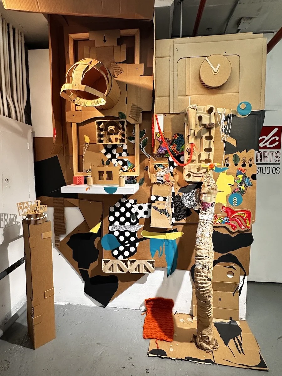 Our friend and neighbor Mei Mei Chang is one of the most interesting artists in Washington! Her work is inventive, playful, funny, and delightful, as well as subtly expressive. She has a show up now at Willow St. Gallery in Takoma Park, and we stopped in at the opening this afternoon. I loved this cardboard record player, with little cardboard records that you can place on the cardboard turntable.