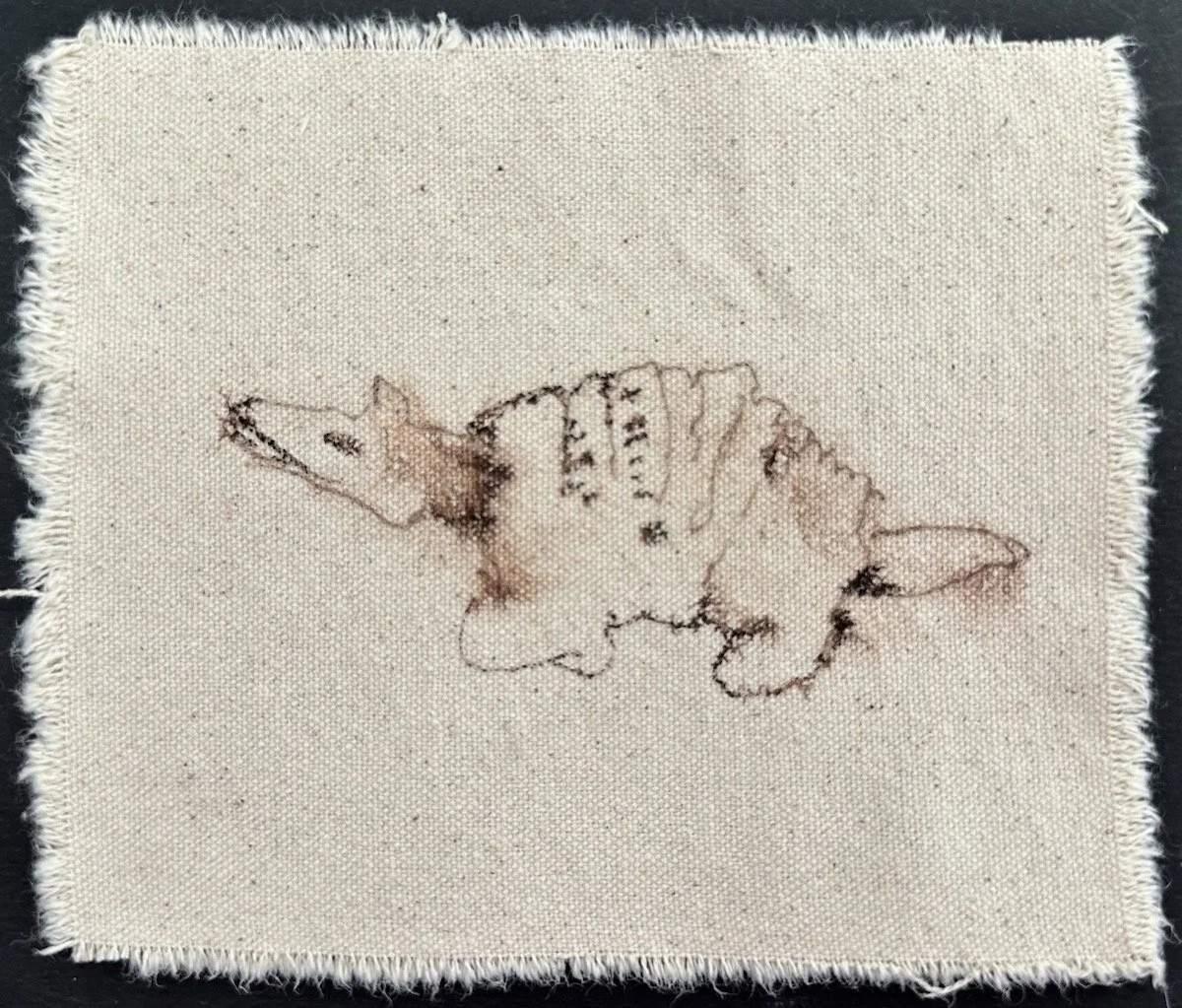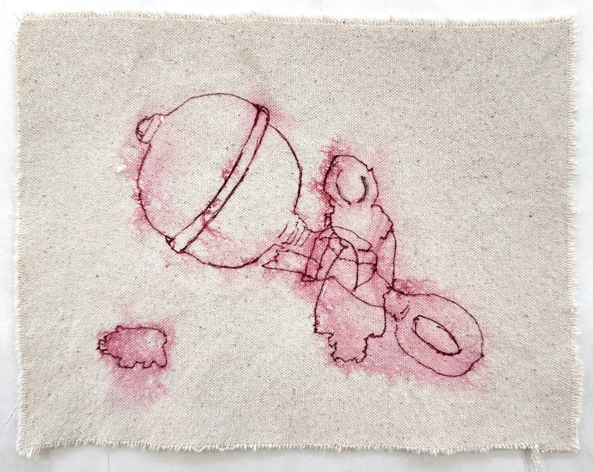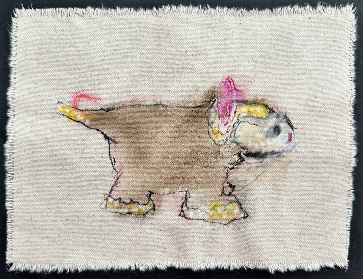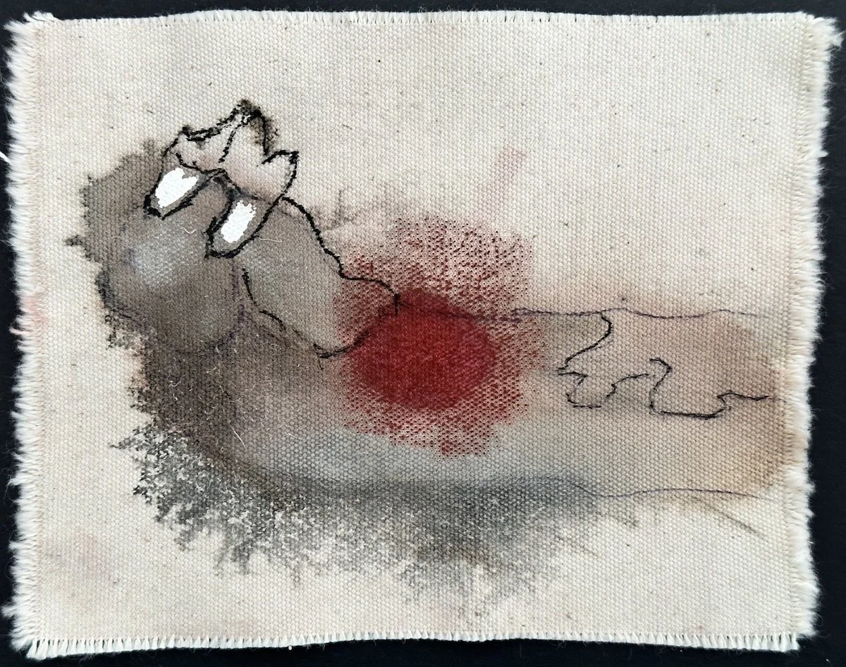 Around the end of 2023, Marilyn’s encaustic paintings started creeping over the boundaries of her rectangular supports and becoming more sculptural. So she began making sculptures from sticks, bones, wax and plaster from images in her dreams, like little boats. She was also picking up wood chips and sticks and bits of pine cone and bones on our walks and putting them in a little canvas bag. Eventually she began drawing some of these small objects on scraps of old canvas that she had saved from when she painted large paintings. The images of sticks began to combine with the images from dreams and dolls, toys, and other items of childhood memorabilia, and a whole new body of work began to form. The old canvas took the ink in very interesting ways, which newer canvas does not do as well.