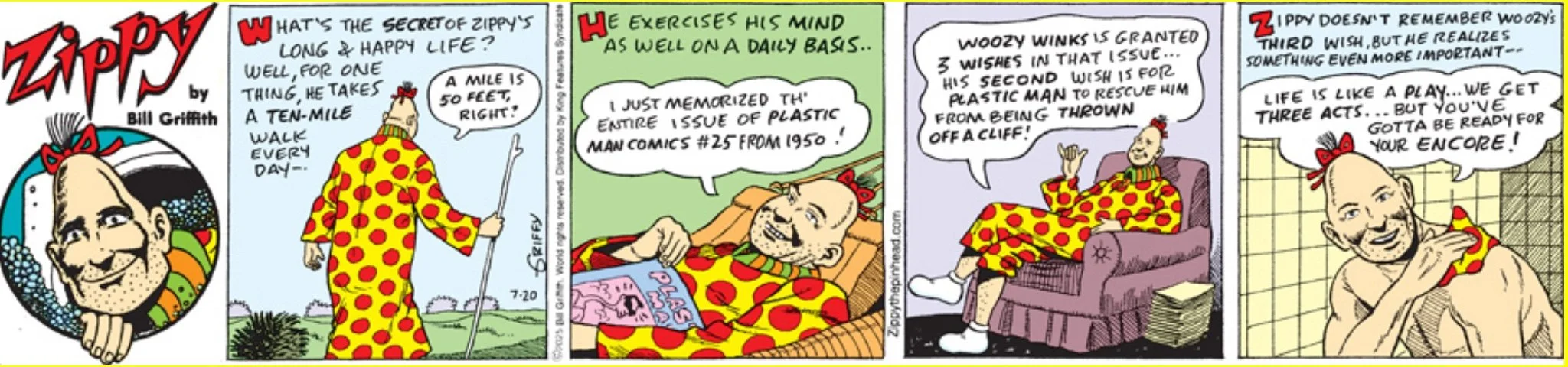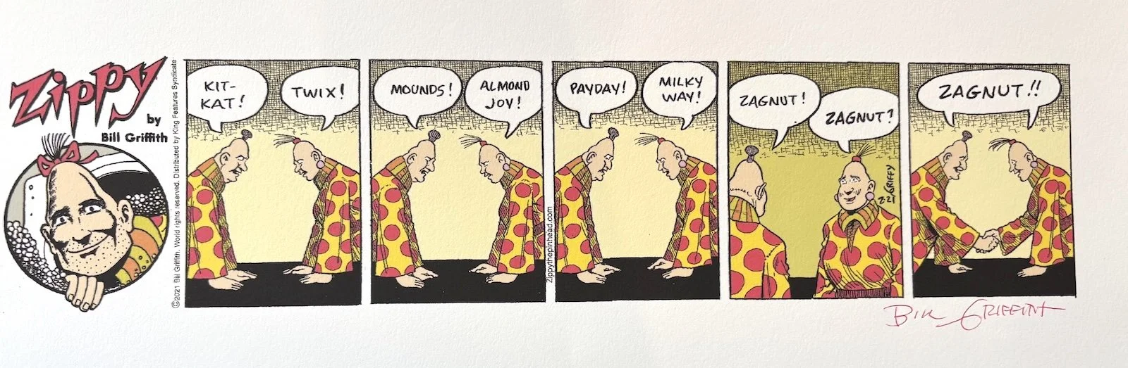 I have been reading Bill Griffith’s “Zippy” cartoon forever. In fact, when the Washington Post dropped the strip in 1988, I cancelled my subscription in protest (so I didn’t need to do it again after Bezos took over). I am amazed and grateful that Bill Griffith puts out a new and wonderful strip EVERY DAY!
